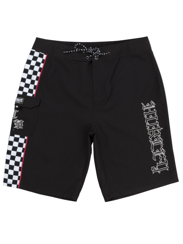 Experience the ultimate fusion of functional design and bold streetwear aesthetics with these Gothic Cargo boardshorts. Crafted from premium 100% polyester supersuede fabric featuring a straight-leg cut and 11″ inseam. Designed with practical cargo pocket storage featuring velcro closure and grosgrain pull, custom embroidered initials, and striking side panel checker print with contrast piping. Finished with distinctive Phantom heat transfer detailing for authentic signature style.